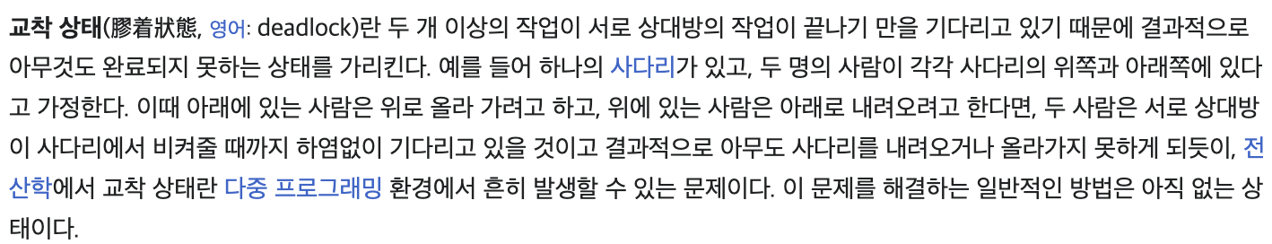 네가지 조건 모두 만족해야 데드락이 발생하고 이중 하나라도 만족하지 않으면 데드락이 발생하지 않는다.