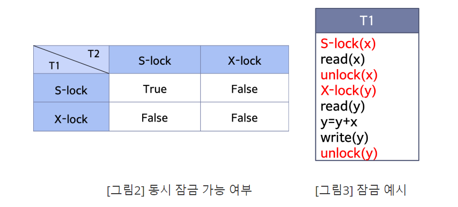 트랜잭션 T1이 데이터항목 D에 대해 S-LOCK(D)을 설정한 경우에, 트랜잭션 T2도 데이터항목 D에대해 S-LOCK(D)를 설정할 수 있다.
